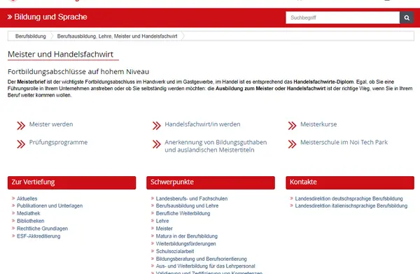 Alle Informationen zur Südtiroler Meisterausbildung und zum Diplomlehrgang "Handelsfachwirt/in" finden Sie auf der Website der Berufsbildung der Autonomen Provinz Bozen.