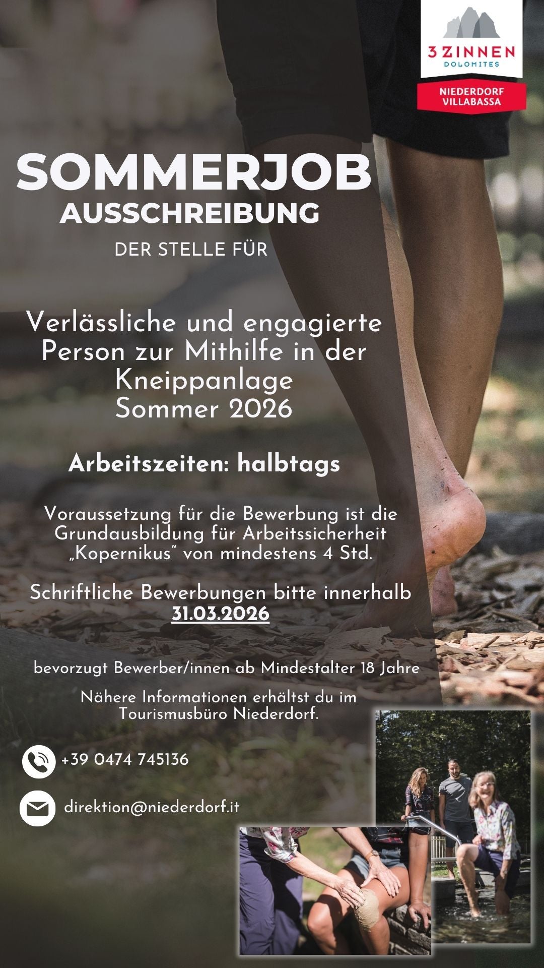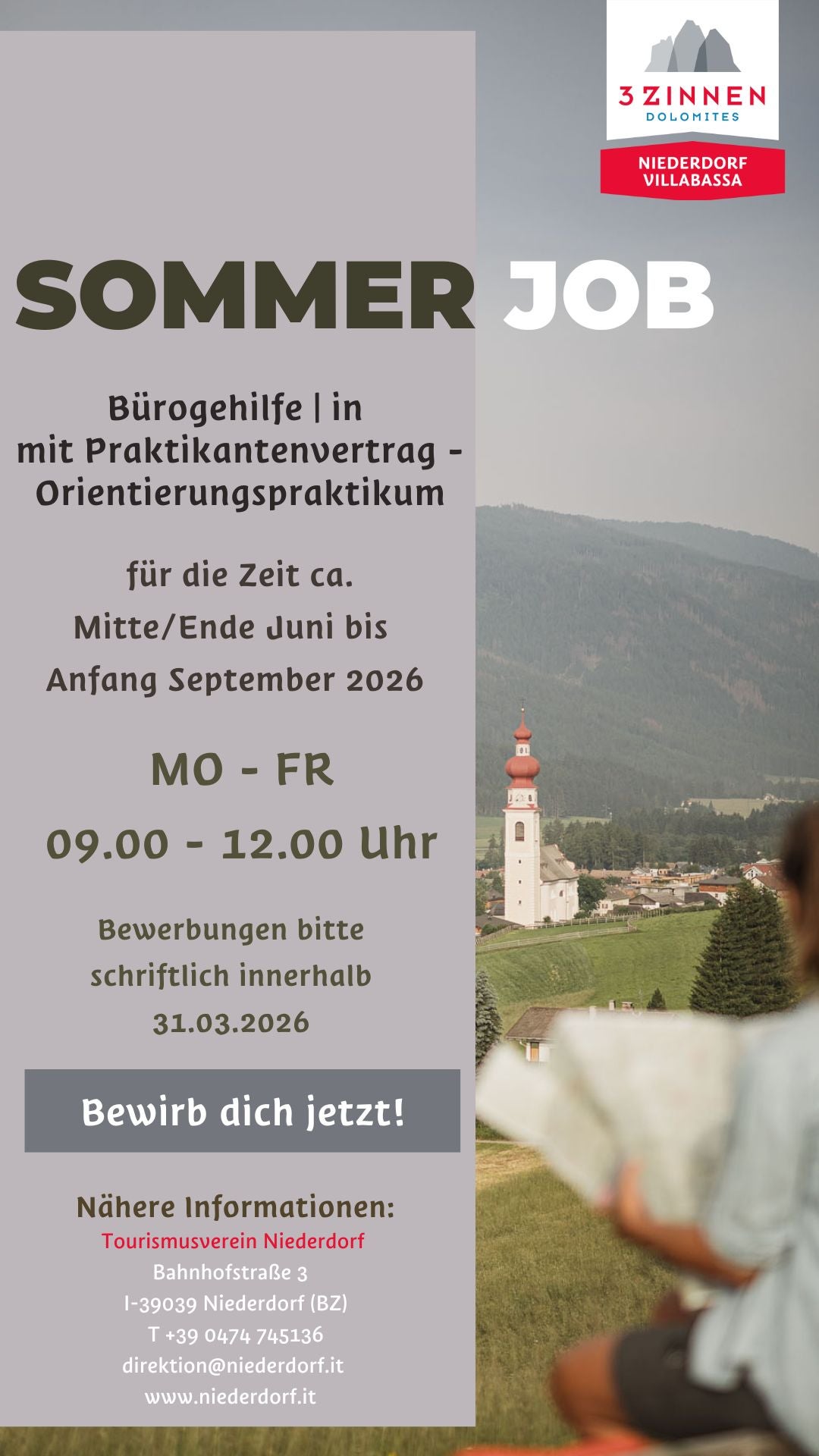 Tourismusverein Niederdorf sucht 08.02.2026 | Stellenmarkt einen Bürogehilfen (m/w/d) und Mitarbeiter in der Kneippanlage (m/w/d) Dokumente zum Herunterladen 2026_Praktikum Sommer Büro.jpg (181 KB) » 2026_Praktikum Sommer Kneipp.jpg (288 KB) »